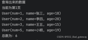 System.out.println("查询出来的数据"); System.out.println("当前为第" + page + "页"); userList.forEach(System.out::println); System.out.println("总数为:" + total); }
